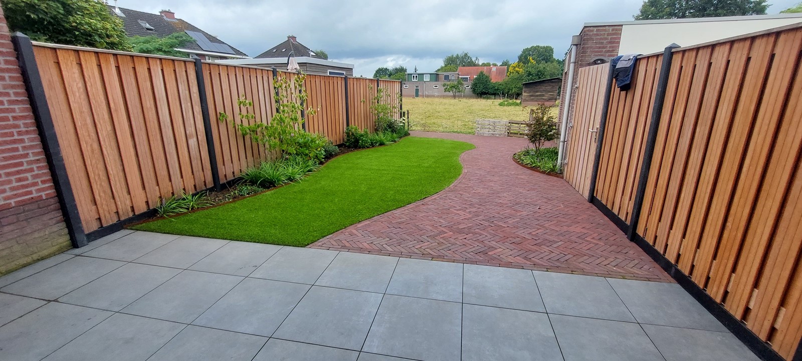 Hier hebben wij een moderne tuin aangelegd, inclusief beplanting, schuttingen en straatwerk.